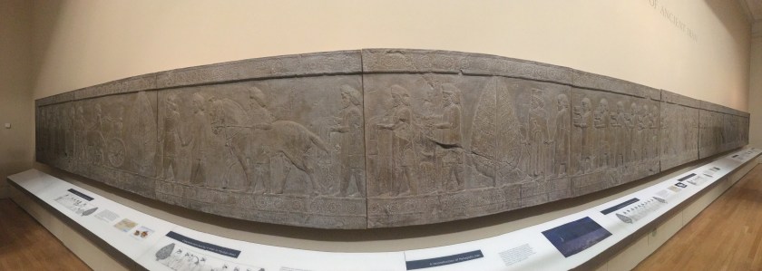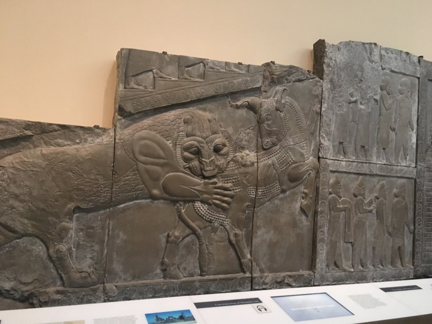 博物馆还做了一份波斯波利斯的恢复后的虚拟视频,虽然不管保护还是展现历史遗迹,大英博物馆都做的比原发掘地要好很多,但是真的无法评说这种盗窃行为。博物馆里还有很多亚述帝国的遗迹,更加宏大。亚述帝国起源于两河流域,就是伊拉克境内的幼发拉底河和底格里斯河。在伊拉克境内也有几处类似于波斯波利斯一样的遗迹。不知道现在还残存多少了。这样看来,英国给弄来博物馆展示也不是坏事,至少保存下一些,何况博物馆还不收费。
