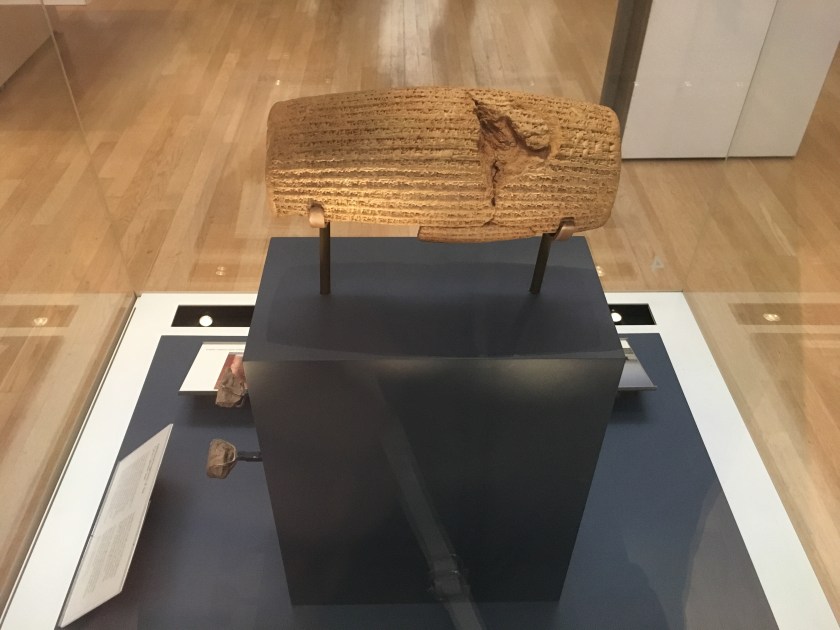这个《居鲁士圆柱》在哪儿呢?在伦敦的大英博物馆。从伊朗回来后,我去了趟大英博物馆,把埃及和中东的部分看了一遍。不管是万国殿阶梯侧面的万国朝贺石雕,还是百柱殿大门上对称的士兵雕像,还是这个狮子把牛推走了的雕刻,都给弄来了……